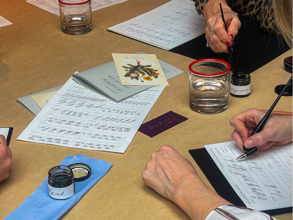 Friendly chatter melts away into quiet concentration, punctuated only by Ridyard’s gentle pointers and encouragement as she circulates around the room. The joy of Copperplate is that it is a script that requires slow-down to successfully replicate its curvaceous strokes and elegant flourishes. There are no prizes for speed today — and no judgment if you need to order a second coffee from the next-door bar.