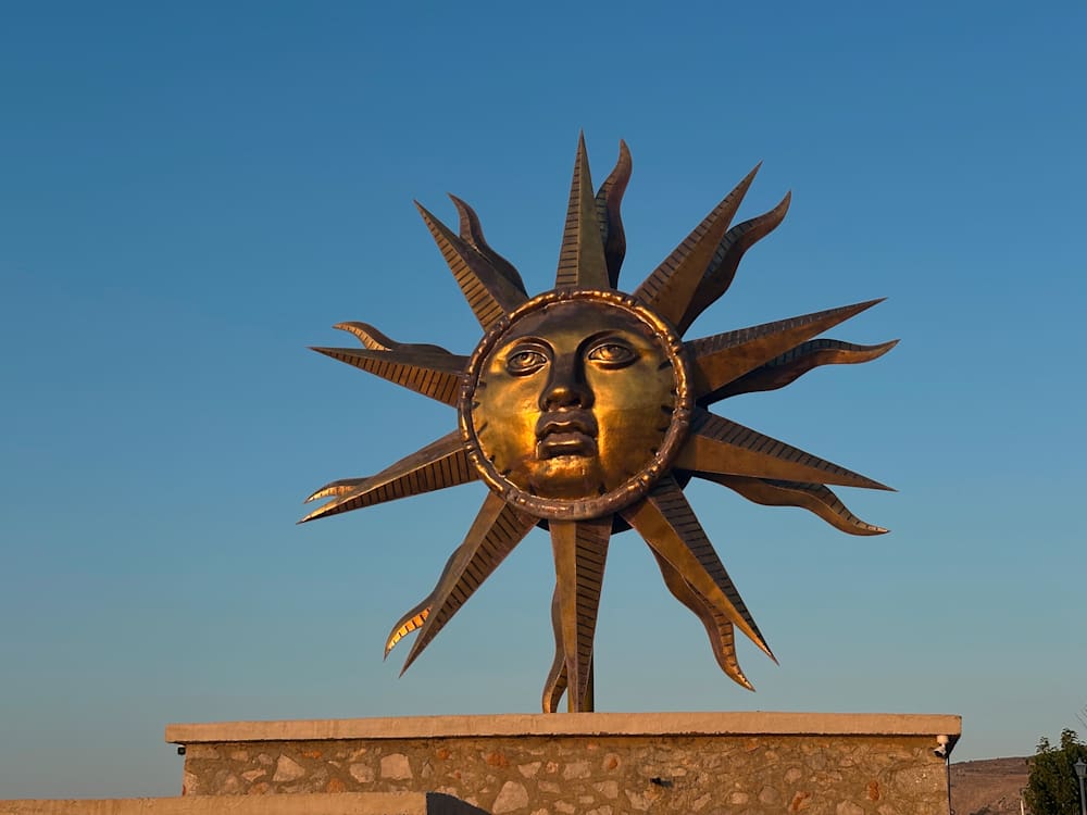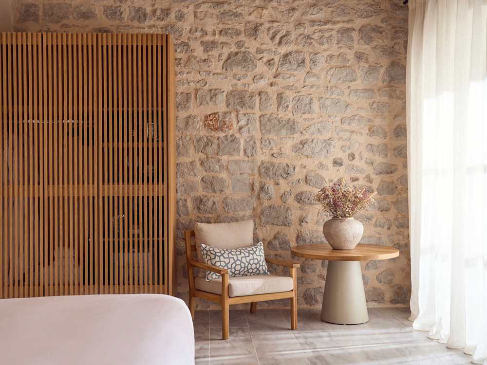 I’m met at the port by a sprightly, English-sounding chap in a pair of shorts — Arthur, the founder of Mandraki Beach Resort, who grabs my case and leads me past a row of donkeys along the bustling harbour and onto the house boat, for the short journey past the all-seeing, spinning Jeff Koons sculpture of the sun, Apollo, around to the hotel’s cove. The setting of Mandraki is perfection, on its own beach with an old-school taverna next door, its rooms and restaurant within a repurposed naval base and shipyard.