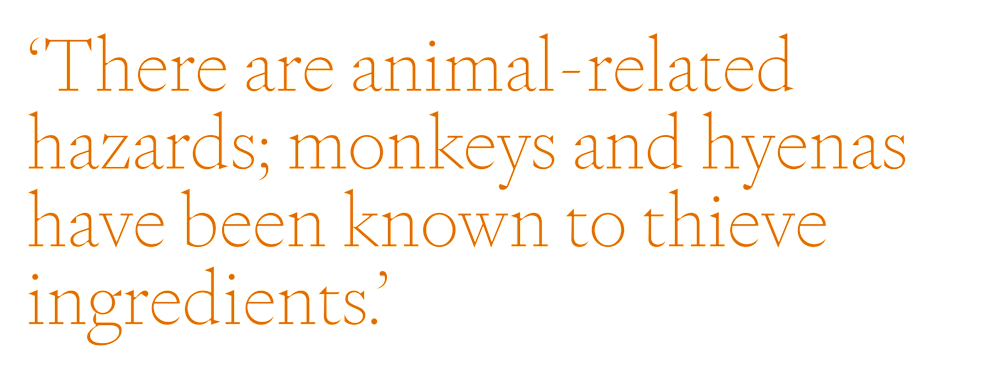 At Matetsi Victoria Falls, it’s a similar story. ‘Our biggest challenge remains the consistency, quality, and availability of protein and fresh produce,’ says Chef Mxolisi, prompting the lodge to plant its own herb-and-vegetable garden. Asilia Africa has made waves with its very own vertical, solar-powered, hydroponic farm in the heart of the Maasai Mara, which guests from neighbouring Naboisho Camp can tour with the resident chef to pick herbs and taste fresh greens. Wilderness Destinations actively lends a hand to community farms near its Botswanan camps, whether it’s drilling boreholes or sourcing tractors, and buys up produce from local, sustainable food start-ups like Diyoveya Honey, a co-operative led by farmers-turned-beekeepers. Then of course there are the animal-related hazards; monkeys and hyenas have been known to thieve ingredients from Naboisho Camp’s kitchen.