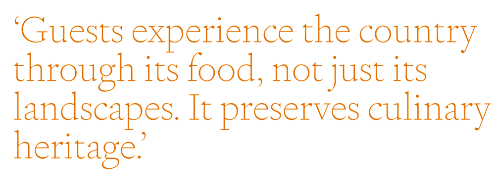 ‘There’s a strong move towards using more regional ingredients,’ observes Simeon Nghipandwa, Resident Chef at Namibia desert camp Wilderness Little Kulala. He reels off some of the country’s seasonal staples: Omajova mushrooms, which grow on termite mounds after the first rains; aloe-plant flowers; ombidi (wild spinach); marula-nut oil. He’s gently introduced many of these into Little Kulala’s menus, including chicken potjie, a spicy stew slow-cooked in a cast-iron pot, with oshigali (cowpea purée) and a drizzle of marula-nut oil. While a couple of their local delicacies, like mopane worms, ‘may be a little too adventurous for some palates’, he acknowledges with a laugh, the message they’re getting from guests is clear: ‘They want to experience the country through its food, not just its landscapes. This is important because it strengthens local economies and helps preserve culinary heritage.’