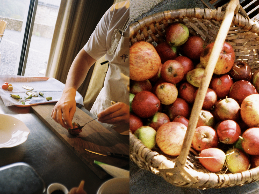 After we’ve passed the herds of English Longhorn and Beef Shorthorn cattle and fed a few more imploring goats, I head back towards the hotel to meet with head gardener Shelley and her adoring black Lab, Basil. With our dogs playing peacefully behind us, she explains how the garden abides by the same cyclical process as the farm. ‘As soon as a gap appears, we fill it. We put a bit of homemade compost on, put a crop in, and then once it comes up, we harvest and go again… We’re making the land work hard, but we’re also putting a lot back into it,’ she tells me, with a passion as infectious as that of George and Caitlin. She talks me through her crops, explaining how the natural pollinators work and what she’s hoping to plant for autumn, before we bump into Brandon Head — Fowlescombe’s senior sous chef — in search of his daily batch of runner beans and tomatoes. As Shelley meticulously makes her selection, she mentions that they’ll be ‘picking tomatoes for another three or four weeks, before putting in a winter kale or lettuce’.