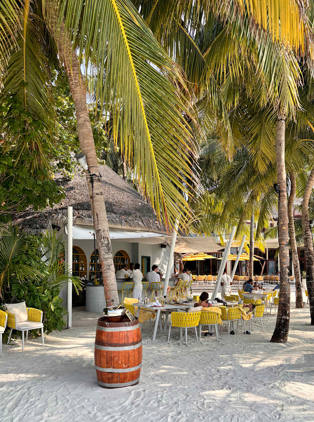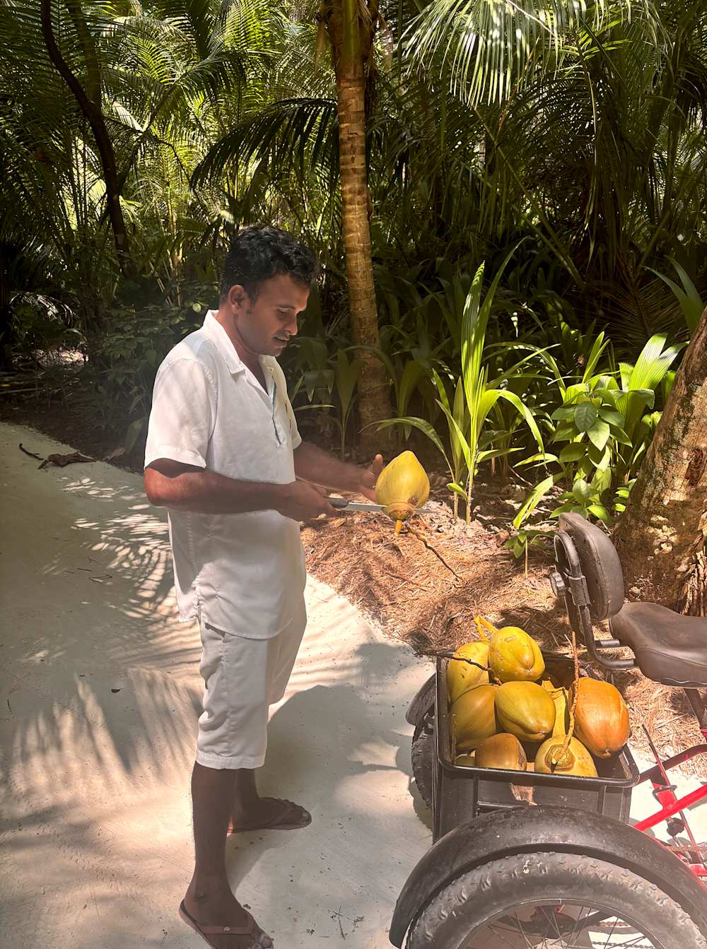 Our commute is by bicycle, pedalling along Niyama’s soft, sandy paths, lanterns glowing at night. The enormous swooping bats, as big as seagulls, add to the otherworldly wonder of the place. And, occasionally, we encounter the coconut man, who materialises just as thirst strikes, hacking open a fresh coconut with his machete and inserting a (biodegradable) straw. Miraculously, he still had all 10 fingers. We checked.