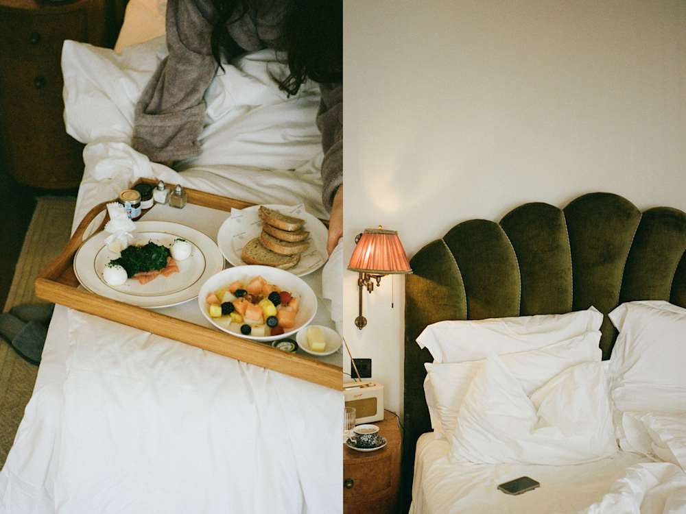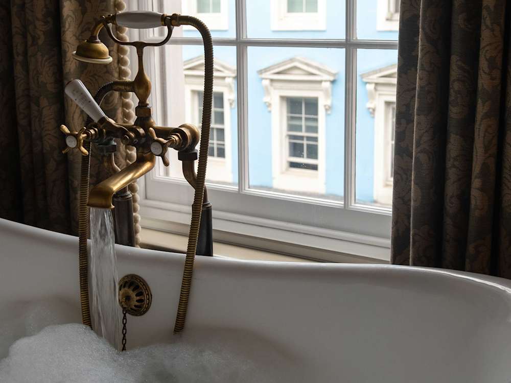 We have zero plans to use any of the above though, flopping on the super-king-size bed for an afternoon nap — after the emotional upheaval of saying goodbye to a place where we met, dated, became engaged and spent lockdown together, we’re happy for a soft place to land, and pillows that cost £175 a pop will definitely do. When it comes to decor, our Medium Room has rummaged through a Fin de Siècle dressing-up box, modelling William Morris prints, fringed tuffets and bathroom tiles with lace-inspired patterns.