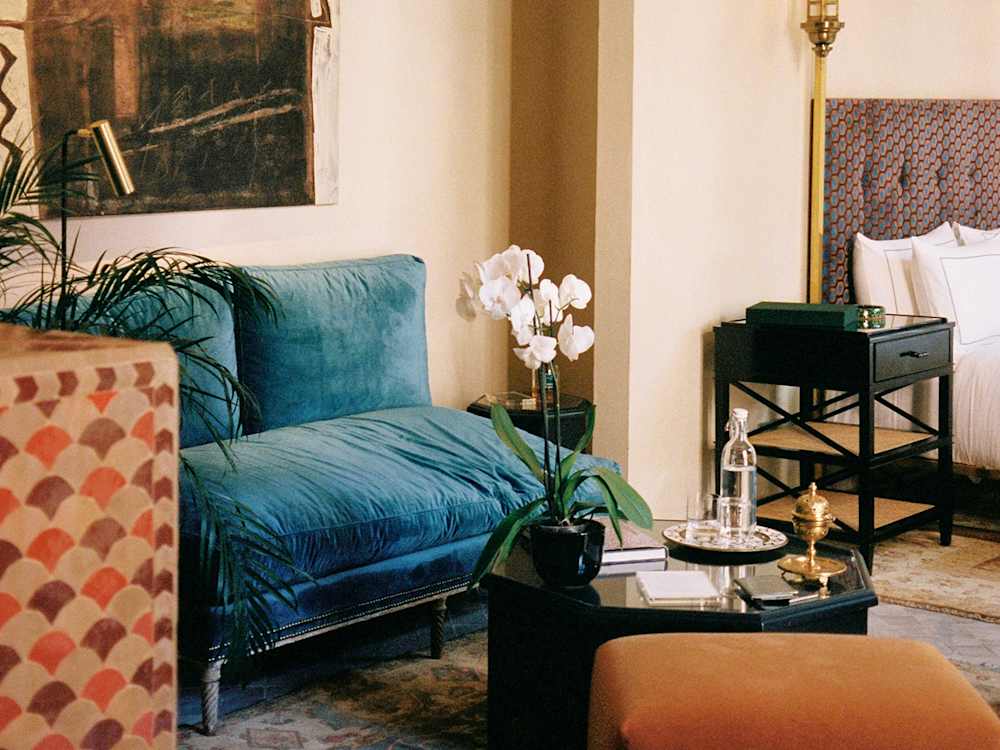 There are only five suites, each arranged around the courtyard, and ours was frankly outrageous for two people checking in with only hand luggage. The fully tiled ceiling looked as though it had been lifted from a Renaissance palace. There was a four-poster bed, a chaise-longue, a sofa, and an enormous fireplace we admired from afar (no need for flames in this heat). The bathroom was vast, stocked with mineral-rich black soap and a homemade scrub for a mini in-room hammam moment. If you’re prone to interior-design envy, brace yourself. I informed Mr Smith we’d be needing a full home renovation on our return.
