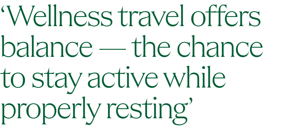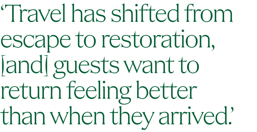 People are experiencing burn-out. Travel has shifted from escape to restoration, [and] guests want to return feeling better than when they arrived. [While away], avoid over-scheduling, prioritise sleep, walk daily, eat simply and choose treatments that calm the nervous system rather than overstimulate it.