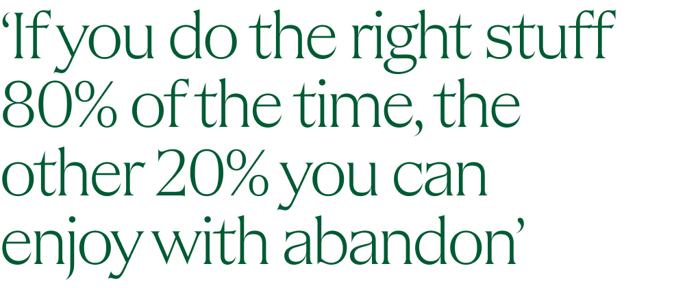 Never overlook the basics — they’re the foundation of health. Go to bed half an hour earlier each night, with some fiction to read — not books about analysis or self-betterment, straight up fiction. And ask what’s the hardest thing to do when it comes to your health: giving up coffee, sex, booze, drugs? What you leave till the end is usually the thing you should do first, because it’ll have the most impact.