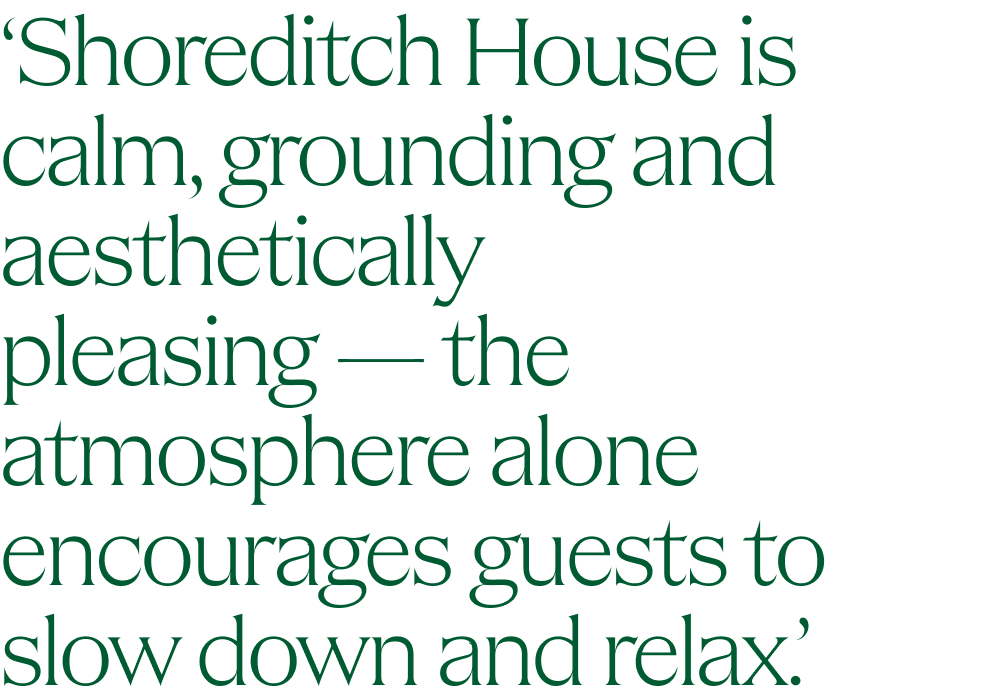 I’m a member and I’ve always loved what Soho House represents, so the collaboration felt very natural. Shoreditch House is calm, grounding and aesthetically pleasing — the atmosphere alone encourages guests to slow down and relax.